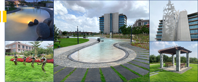 Composition of 2.25 Acre landscaping work using Miyawaki method of afforestation with highlighted snake shaped waterbody in the center